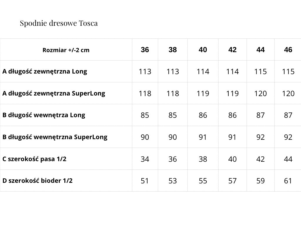 Spodnie Tosca to model stworzony z myślą o wysokich kobietach i codziennym komforcie. Mają średni stan, pas na gumce i lekko zwężane nogawki zakończone gumką. Dzięki temu wyglądają nowocześnie, a jednocześnie są niezwykle wygodne.